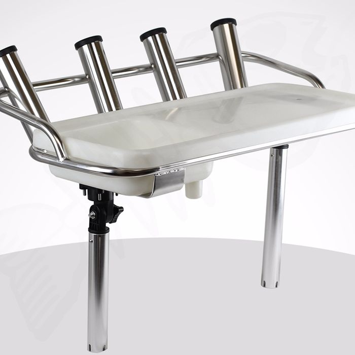 Dual Mount Framed Bait Board With 4 Rod Holders. This bait board setup enables you to prepare your bait or clean your catch while keeping your rods within reach. It features heavy duty marine grade stainless steel framing, removable bait board for easy cleaning and 4 rod holders.