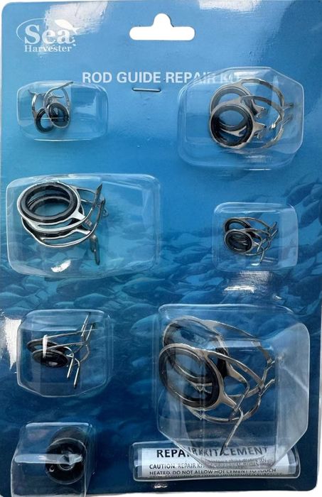 The Sea Harvester fishing rod guide repair kit includes , 2 x 10 mm guides, 2 x 12 mm guides,2 x 20 mm guides, 2 x 25 mm guides, 2 x 30 mm guides , 1 x quick dry glue , 1 spool of binding cord